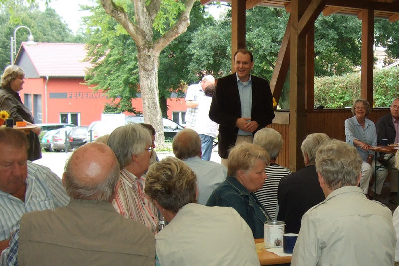 Der Ortsverbandsvorsitzende Wilfried Engelhardt freute sich sehr über die zahlreichen Gäste, die die Gelegenheit wahrnahmen, den Bürgermeisterkandidaten Erik Homann persönlich kennen zu lernen. Dieser stellte neben seinem privaten und beruflichen Werdegang insbesondere sein Wahlprogramm vor. Dabei ging er unter anderem auf die Punkte Wirtschaftsförderung, Familienfreundlichkeit und eine stärkere Einbindung der Ortsteile ein. Besonders hob er die in den vergangenen Jahren geleistete Ortsratsarbeit sowie das ehrenamtliche Engagement der Bilderläher Bürgerinnen und Bürger hervor.   Für die Zukunft versprach Erik Homann sich für die Profilierung Bilderlahes als Reiterdorf und interessantes touristisches Ziel am Randes des Randwanderweges R1 einzusetzen. In diesem Zusammenhang betonte er die Notwendigkeit einer fahrradfreundlichen Wegeführung und Beschilderung.